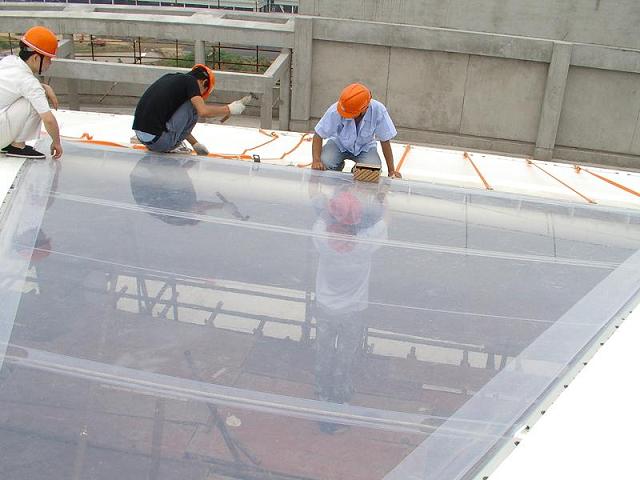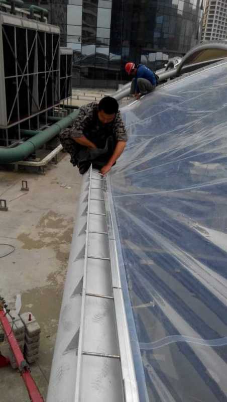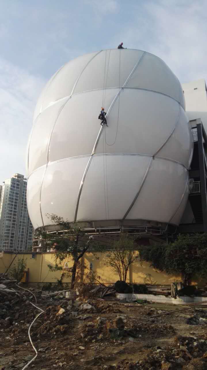4、張拉成型是整個膜結構工程施工的重要環節,施工項目能否取得效果,取決于張拉是否滿足設計要求。在這一步,業主首先要看膜面是否張緊完全(沒有褶皺),外觀要完整美觀,符合這兩點,張拉成型基本就符合要求了。
