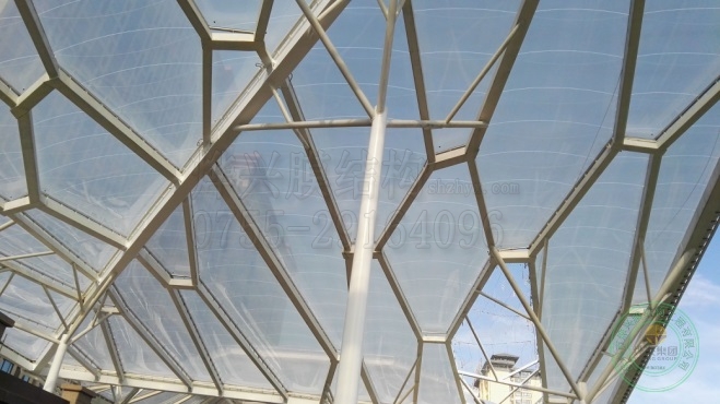 材料結構的區別。ETFE和PTFE都是具有抗酸抗堿、抗各種有機溶劑的特點,幾乎不溶于所有的溶劑,是化學惰性很強的氟材料。ETFE本身具有非常強的韌性和透光性,通常被制作成0.15——0.30mm的薄膜,既可直接單層使用,也可以制作成雙層或者三層的氣枕;PTFE本身化學穩定性很好,但是材料韌性不足,通常是與韌性和強度都比較良好的玻璃纖維織物結合使用,一般說PTFE膜材就是PTFE與玻璃纖維完美結合后的產物,強度高壽命久,能選擇性吸收陽光,擁有遠超PVC膜材的各種性能。